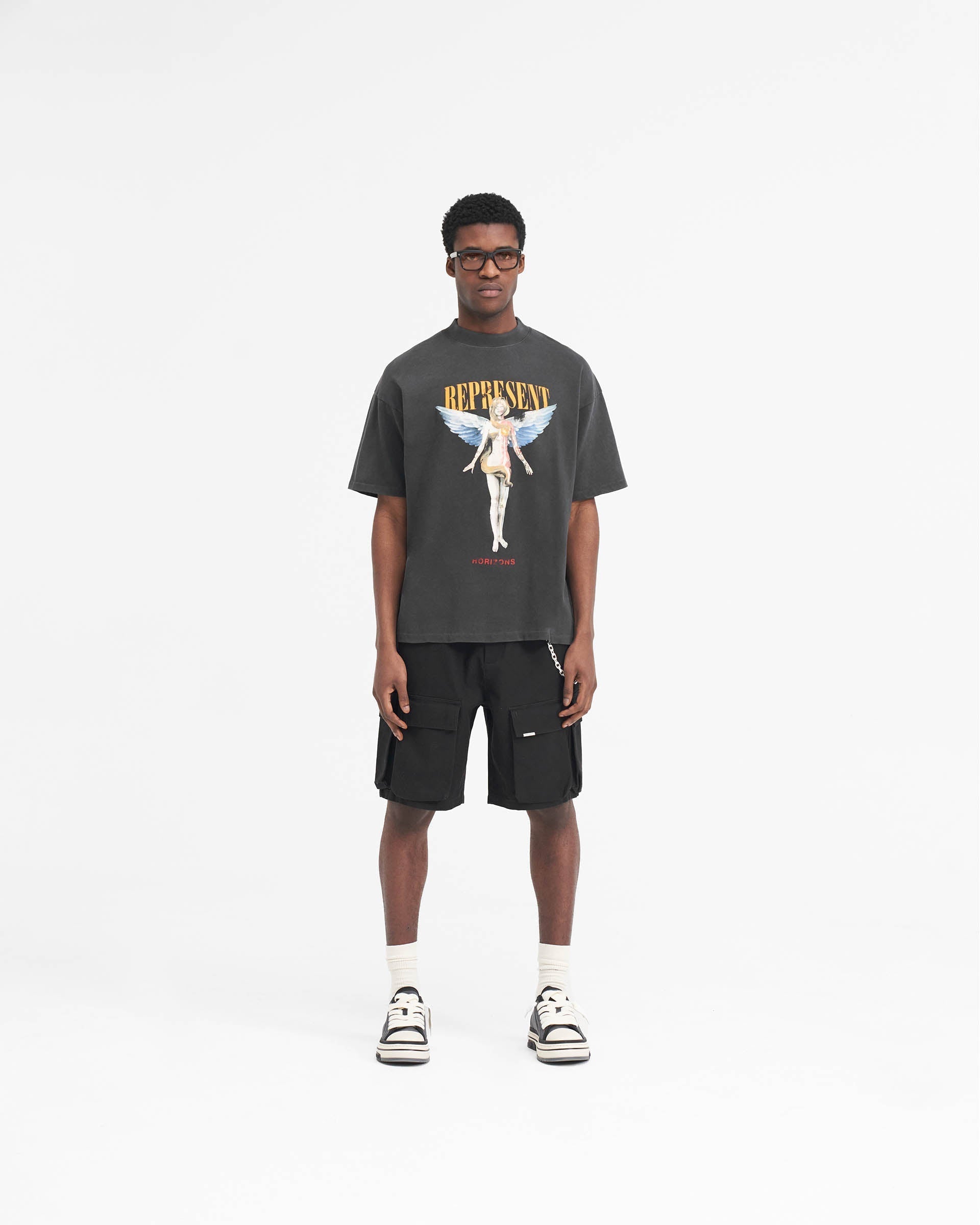 Introducing the Baggy Cargo Short in Black, a luxury cargo short style crafted with a super soft hand feel. These cargo shorts feature a cut and sew v yoke to the back, with oversized 3D pockets. They have a baggy fit, with the addition of an antique silver branded belt loop bar and Represent metal bar to the cargo pocket.