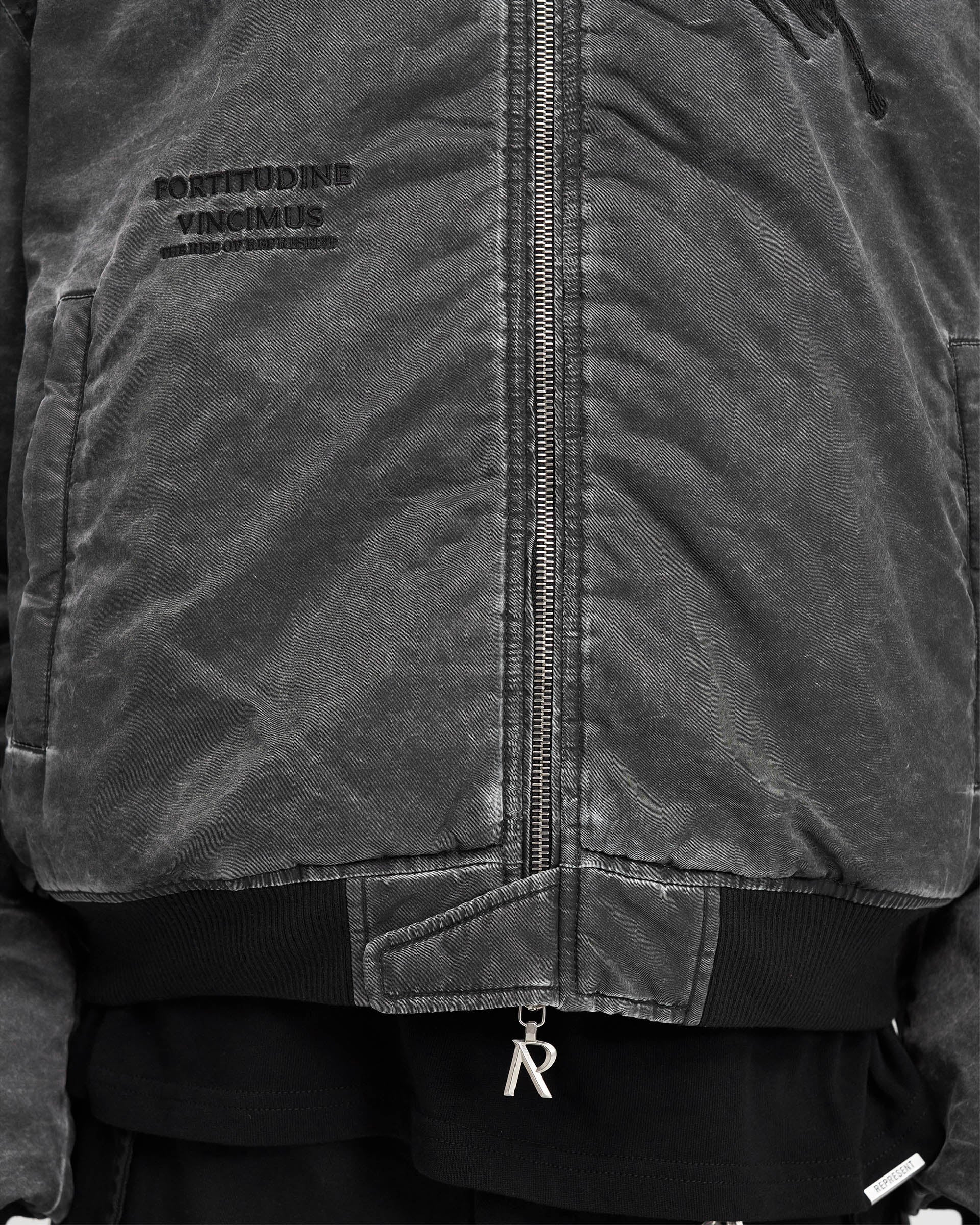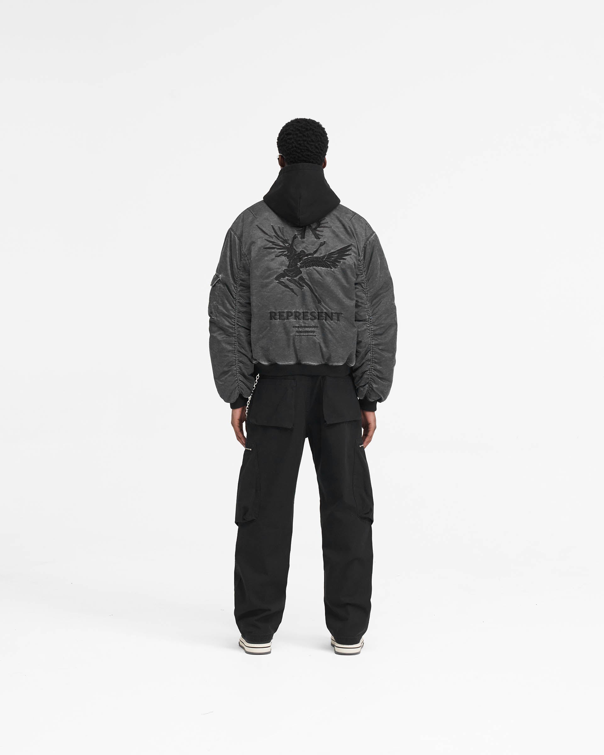 Introducing the Icarus Flight Bomber in Jet Black, a luxury bomber jacket with a garment dye effect throughout. The jacket has gathering details to the sleeves for a voluminous fit, a double ended Initial pendant zip closure to the front, zip hand pockets to each side and arm flap pockets. It has a ribbed hem, cuffs and collar and is finished with embroidered Icarus artwork to the front and back.