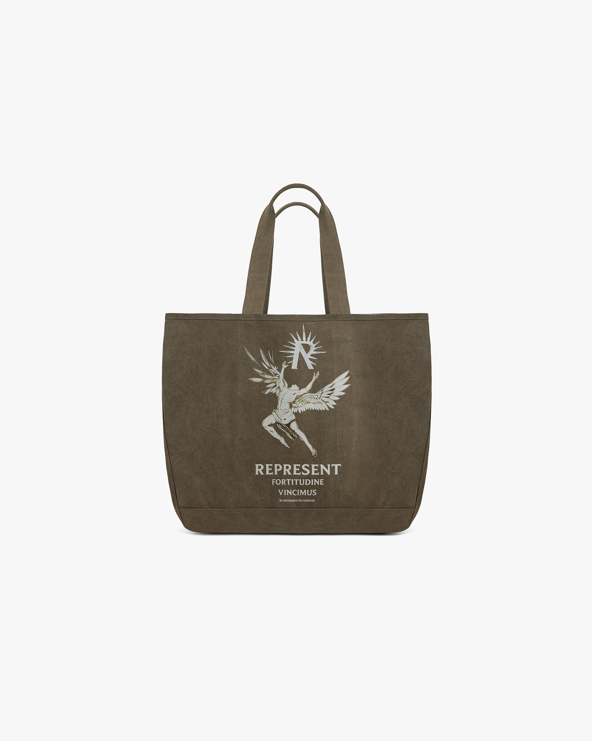 Introducing the Icarus Tote Bag in Taupe, a structured tote bag with reinforced bottom, v shaping to the sides for structure and a self-fabric inside pocket. The bag has a screen print graphic and the seams are finished with binding.