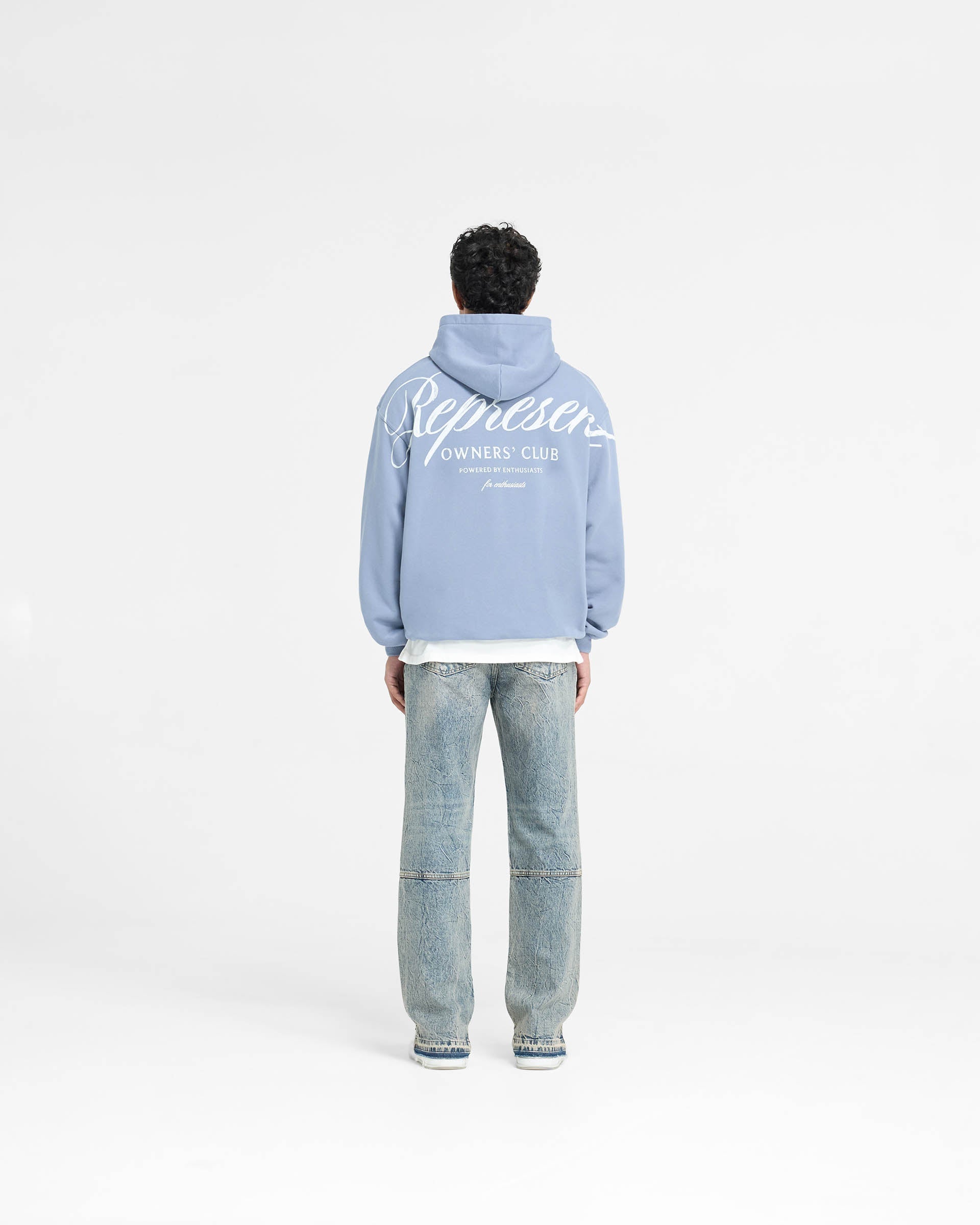 Introducing the latest evolution of the Represent Owners’ Club Hoodie in Dusty Blue, crafted from heavy weight jersey cotton with a slightly oversized fit. The hoodie features a ribbed hem and cuffs, with a Cobrax popper to the hood and Represent metal bar to the pocket.